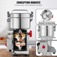 Le moulin à grains électrique VEVOR 1000 g est un broyeur professionnel haute vitesse conçu pour réduire en poudre fine les grains secs, les épices, les céréales, le café, le maïs et les poivrons. Doté d’un puissant moteur de 3000 W et d’une chambre de broyage en acier inoxydable de 1000 g, il garantit des résultats rapides, uniformes et efficaces.