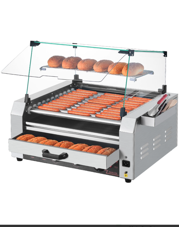 Macchina per hot dog VEVOR - Capacità per 30 hot dog, griglia a 11 rulli in acciaio inox con scalda-pane, 2400 W