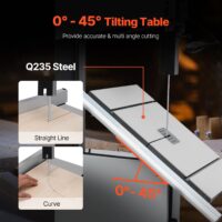 Équipée d’un moteur de 1 100 W (1,5 CV) et d’une vitesse variable de 440 à 846 tr/min, elle permet des coupes précises et maîtrisées selon le matériau. Son éclairage de travail intégré améliore la visibilité, tandis que le guide d’onglet assure des coupes droites ou inclinées avec précision.