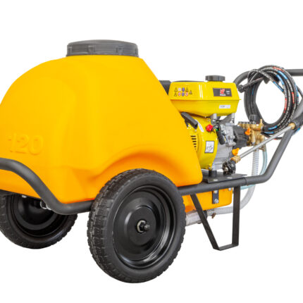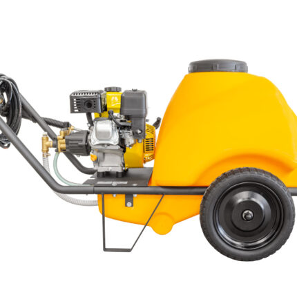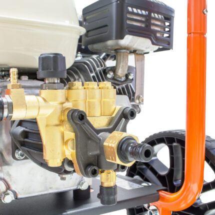 Petrol high pressure washer with Honda GP200 engine delivering 220 bar and 11 L/min for professional cleaning.