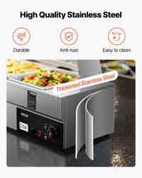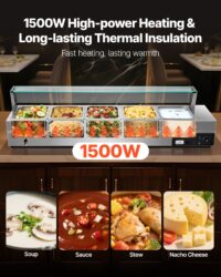 Le chauffe-plats professionnel VEVOR 1500W est un bain-marie électrique conçu pour maintenir les aliments préparés à une température de service sûre et constante. Doté d’un puissant système de chauffage de 1500 W et d’une vitre de protection, il est idéal pour les buffets, les traiteurs, les restaurants, les hôtels et les événements.